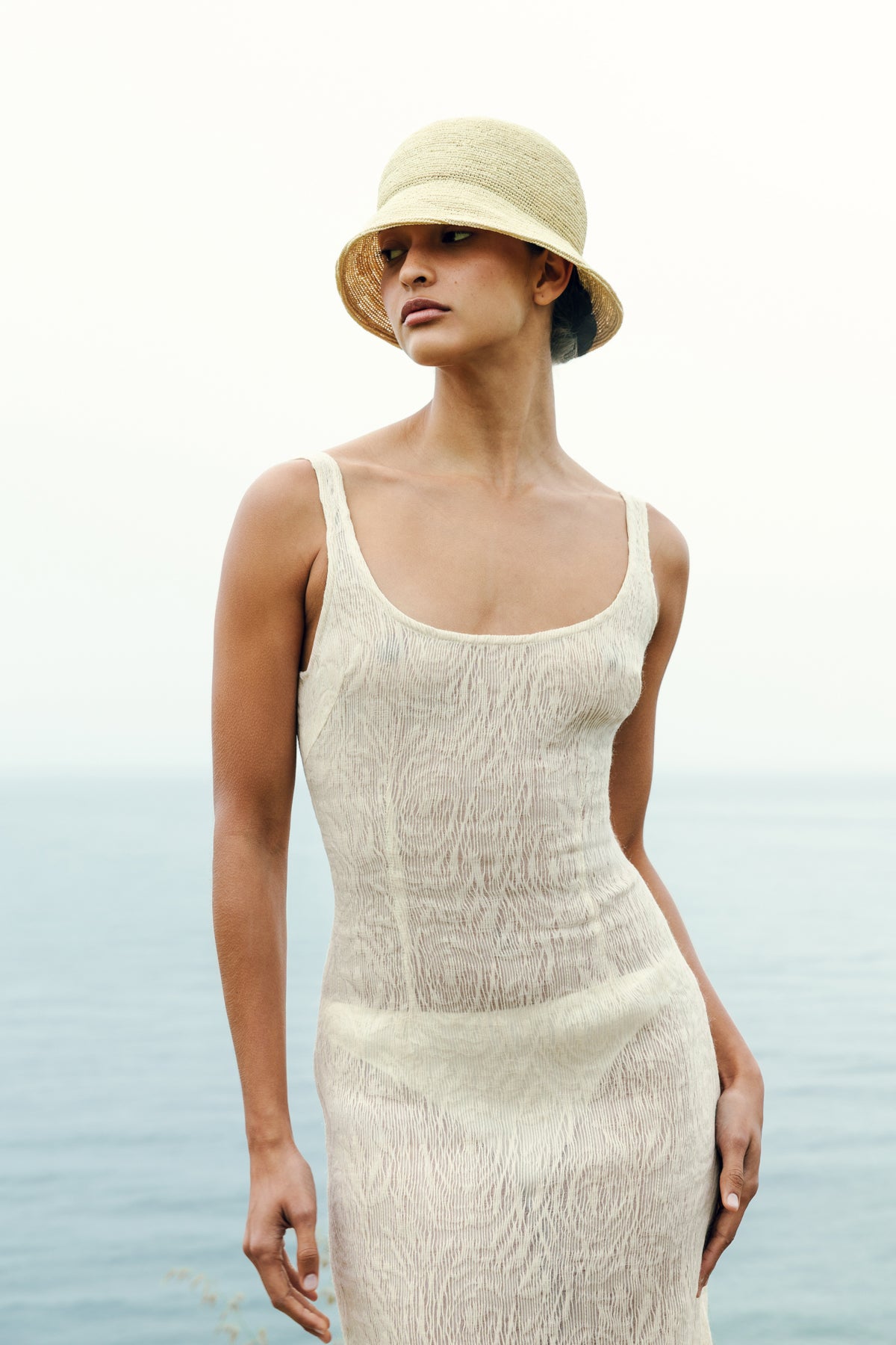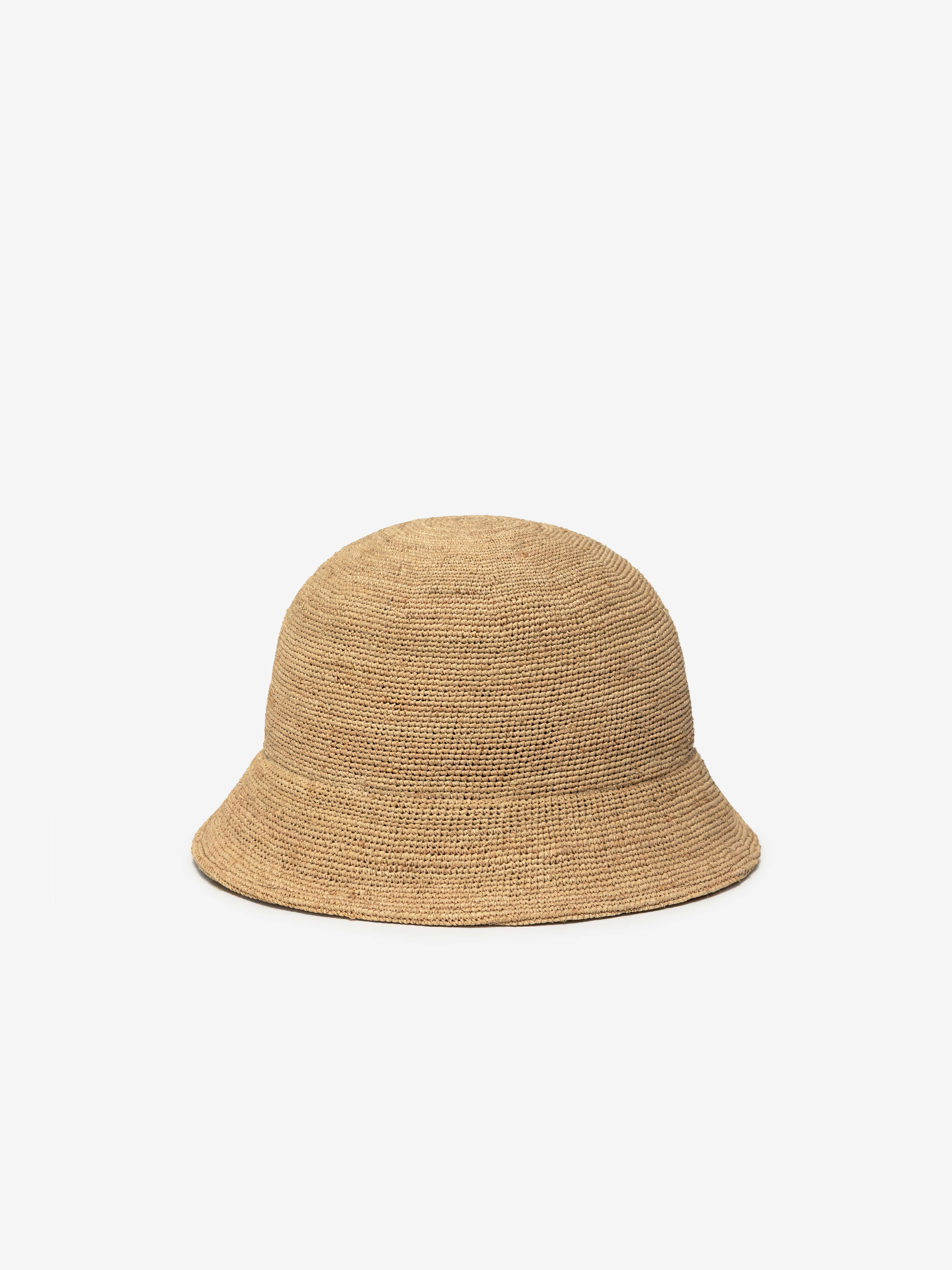 Effortless style meets artisan craftsmanship. Hand-crocheted from natural raffia, this short-brimmed bucket hat features a unique weave that is both structured and flexible.